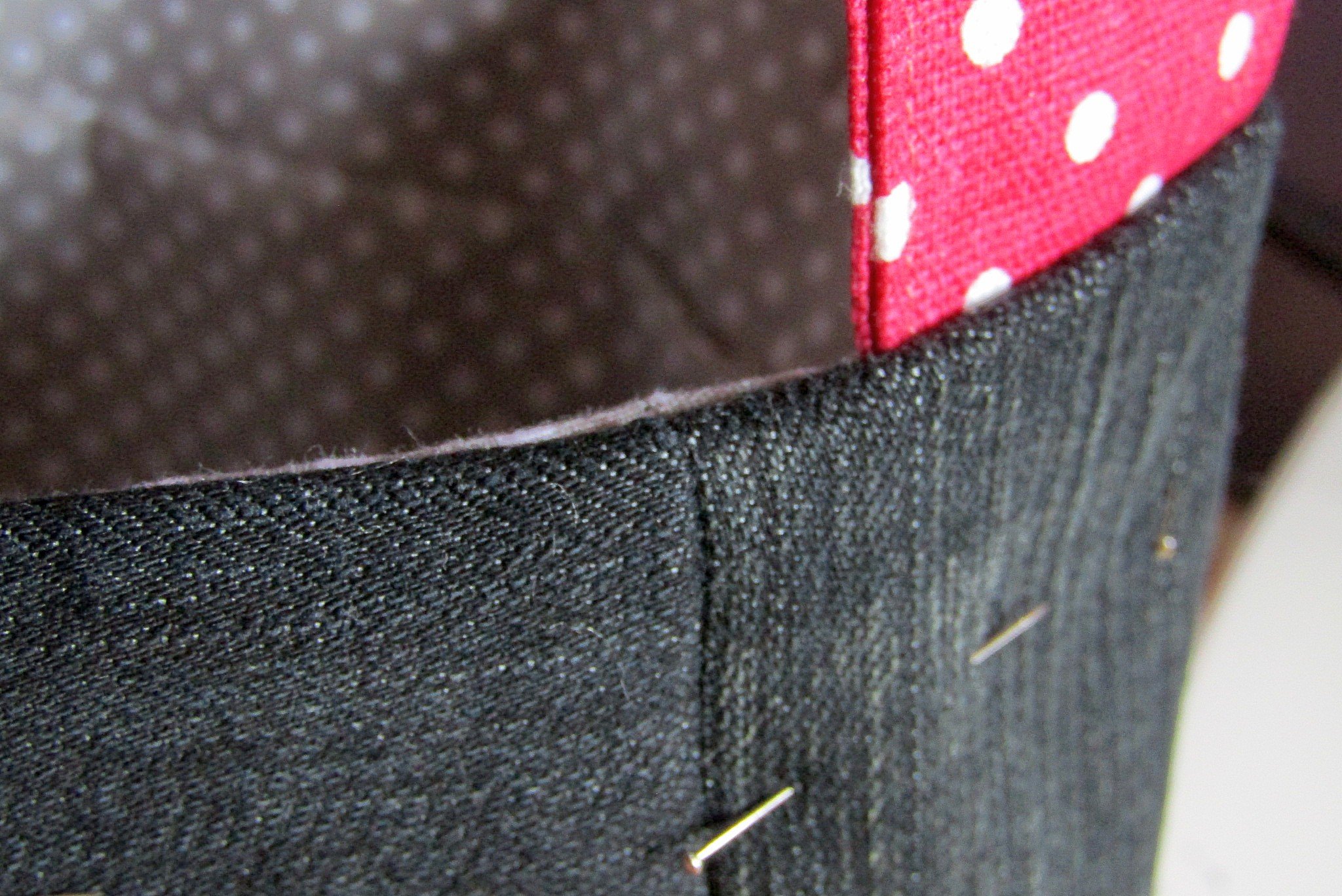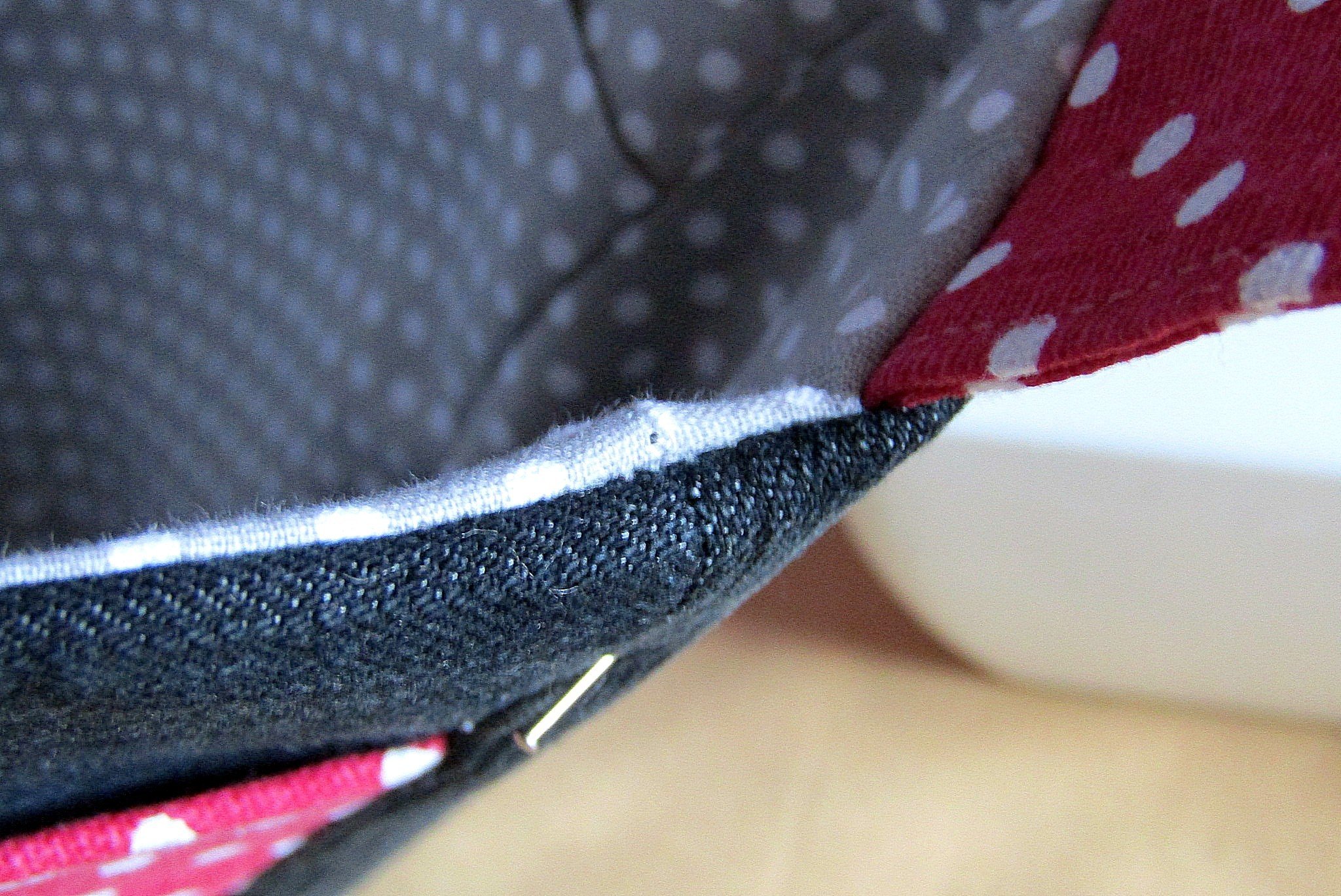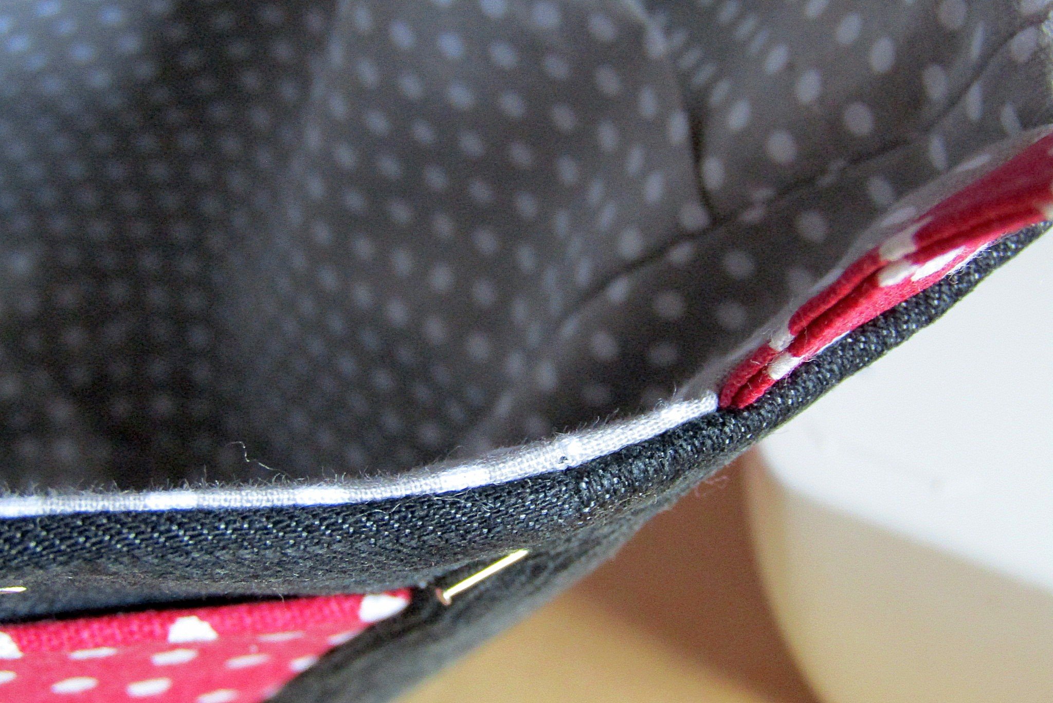 A képen egy táska széle látható, miután a bélést belesimítottam a helyére. Szeretném a a táskát körbe varrni. Az oldalak összevarrásánál bizony több réteg került egymásra.