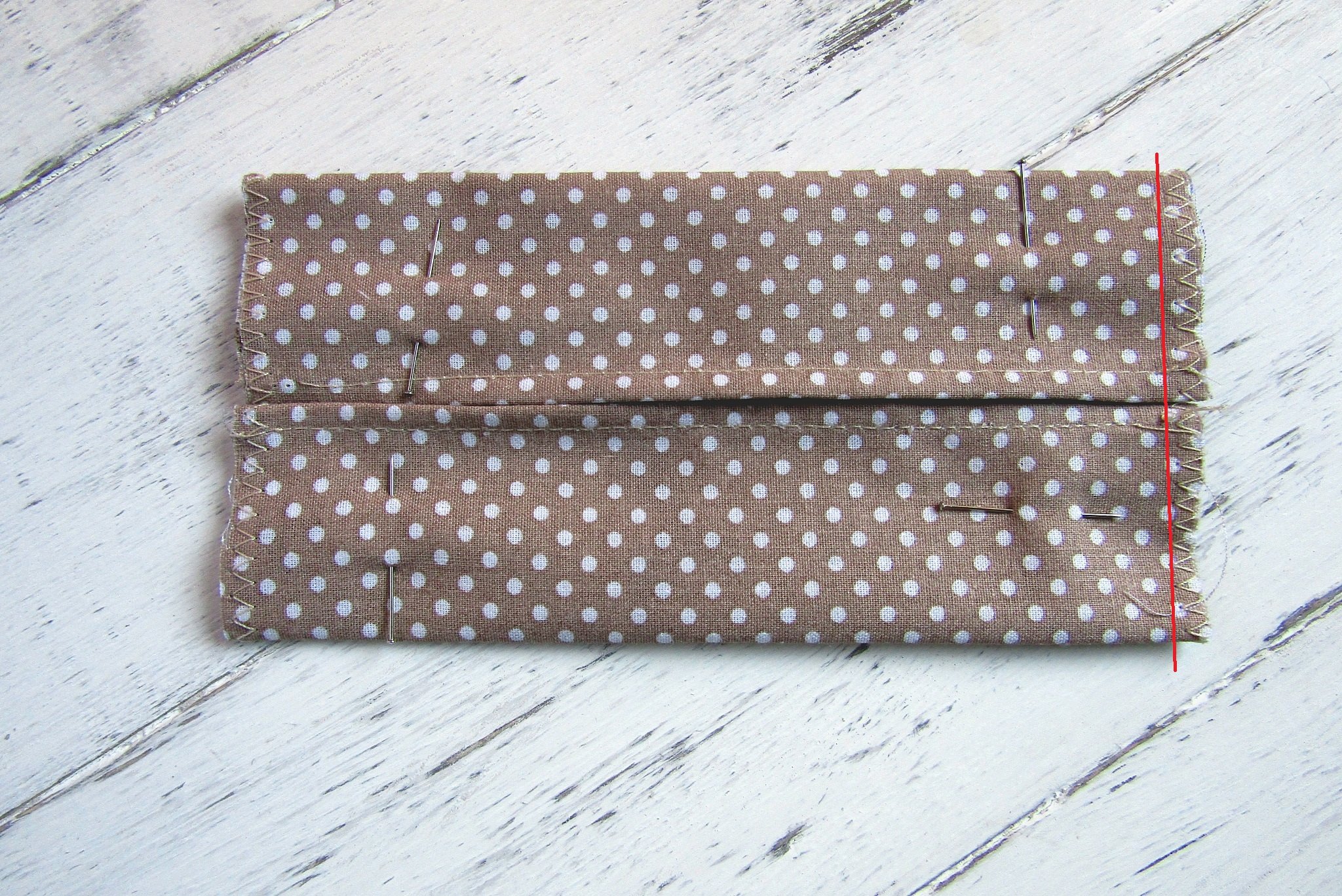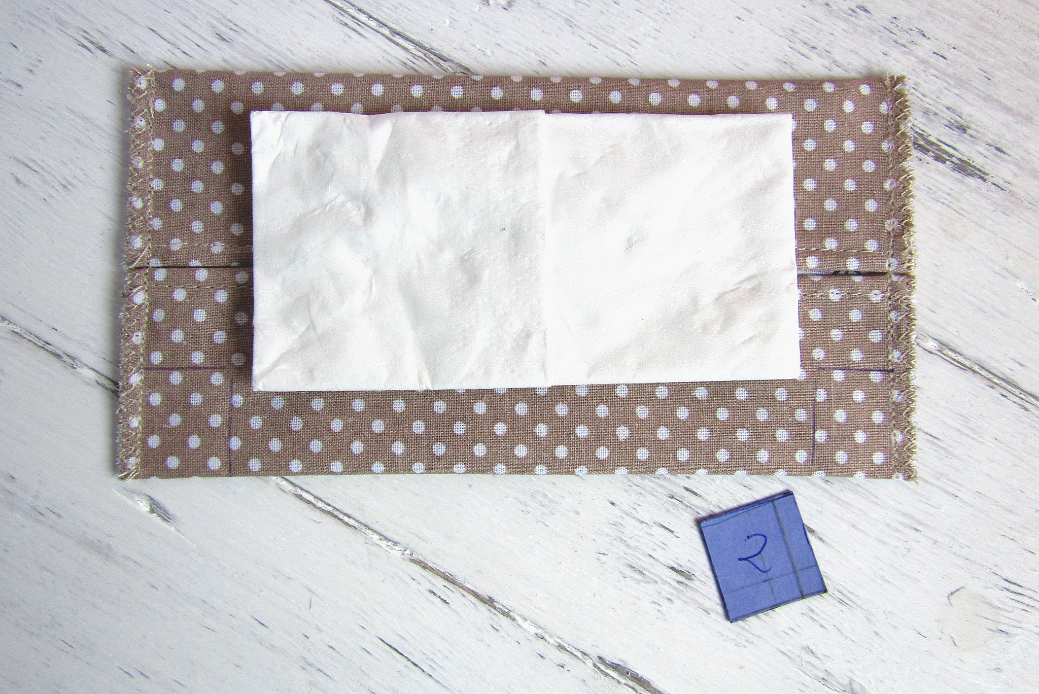 Az az oldal legyen felül, ami később a zsepitartó külső része lesz. Most a rövidebbik oldalát hajtsd fel a varrás szélességében (ez fél cm)